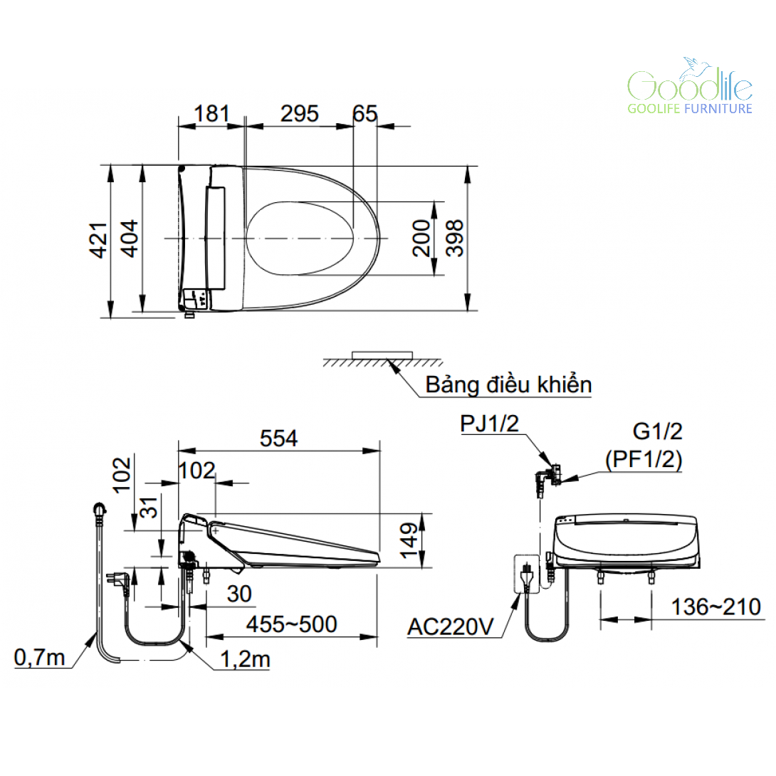 45W Nhiệt độ bệ ngồi: OFF: Nhiệt độ phòng, LOW: ~28oC, MID: 36oC, HIGH: 40oC