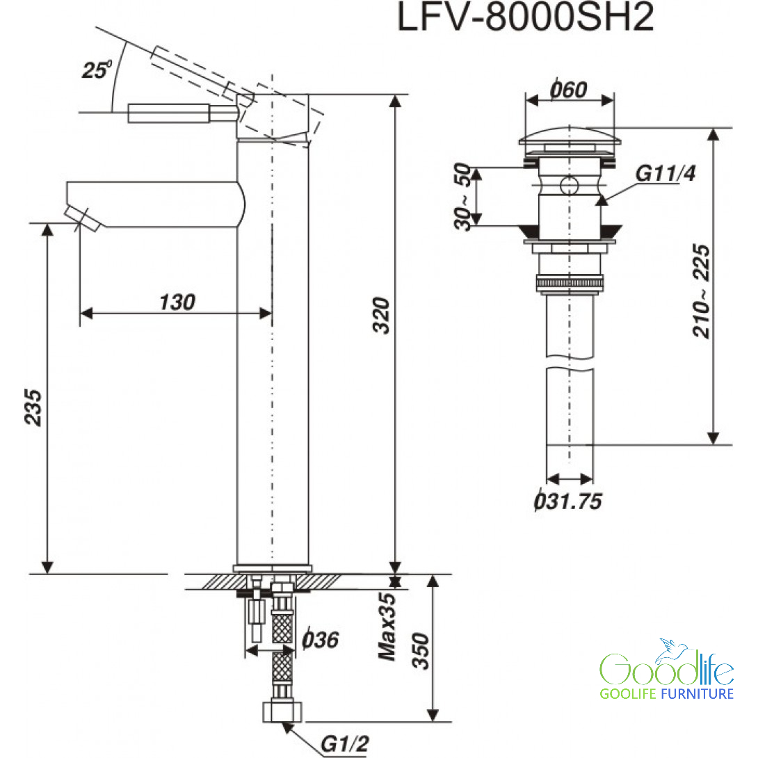 320 mm (chiều cao cổ cao phù hợp lavabo đặt bàn)